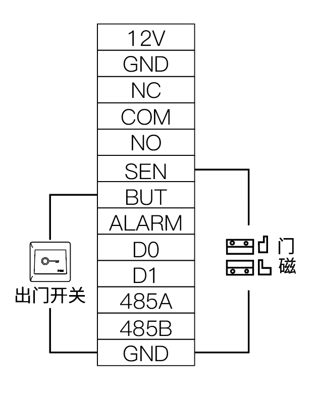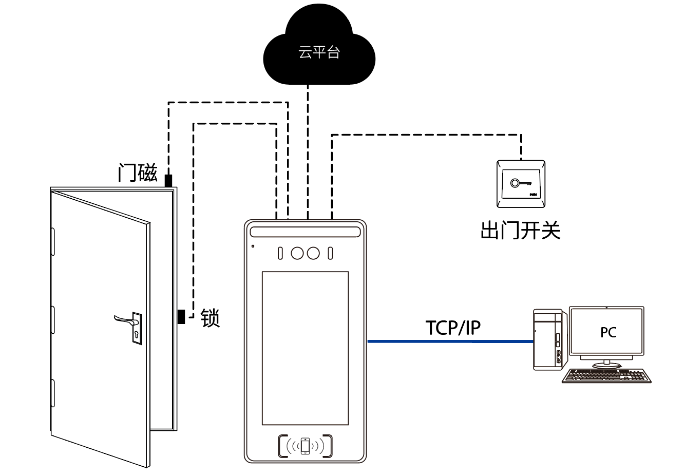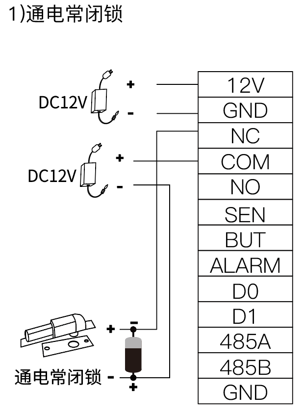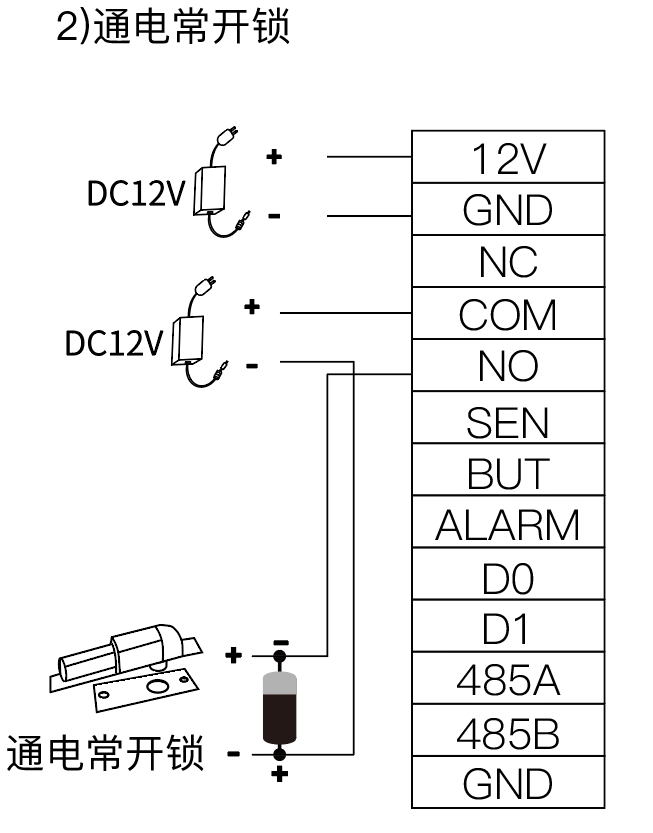 本设备可支持常开型和常闭型锁,对通电时打开,断电时关闭的锁,应使用NO端子,对通电时关闭,断电时打开的锁,应使用NC端子。